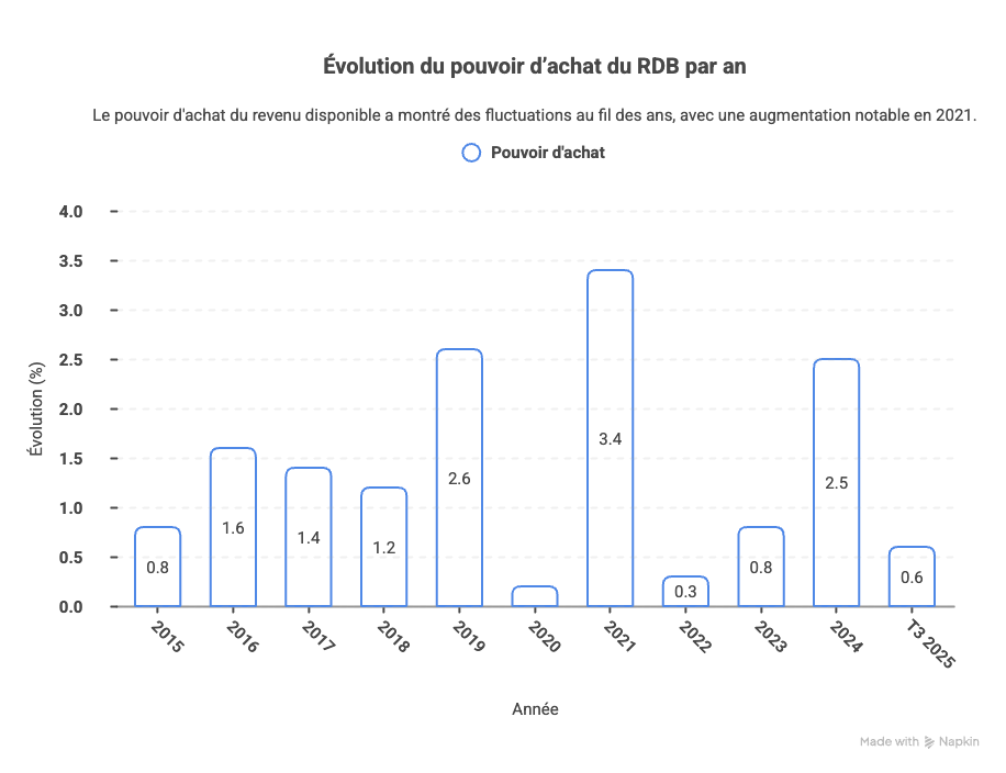 Sur l’année 2025, le pouvoir d’achat du RDB global des ménages a augmenté de seulement 0,6 % (selon les dernières données disponibles, en octobre 2025).